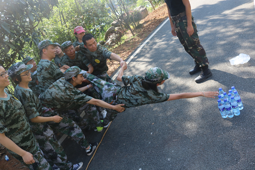 本次训练的第三个项目是进行隔空取水。教练员分别将十瓶矿泉水呈金字塔形放置在离端线两米处的位置,要求队员在取水过程中身体任何部位不能接触地面,否则视为取水失败。在童话故事中,乌鸦取水,尚可凭一己之力,但在本项目中,唯一的取水办法,只能依靠全体队员的团队协作。由于矿泉水摆放的位置有远近之分,各队员之间的身形亦有高矮胖瘦之别,这要求队员们拥有一颗懂取舍,知兼顾的心。
