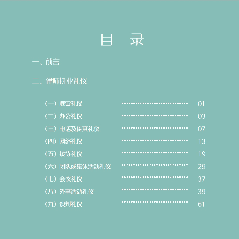 现将北京市律师协会外事工作委员会以"严格规范 竞争创新"为核心内涵编辑制作的《首都律师礼仪手册》转发给我市律师,本版手册以图解的形式生动展示了律师执业过程中的各项礼仪,旨在帮助每一位律师打造更加优雅得体的个人形象,塑造律师行业的良好风貌和整体形象。希望大家能够以首都律师的规范来要求自己。