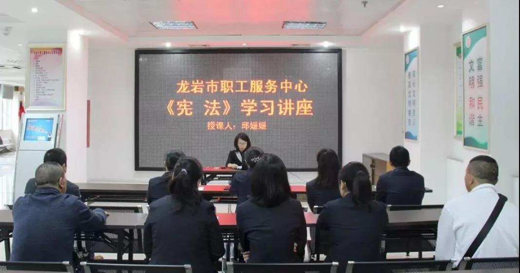 10月16日上午,市职工服务中心举办《宪法》学习讲座,龙岩市总工会法律援助志愿者律师邱媛媛授课,服务中心全体工作人员及前来办事职工一同听讲。