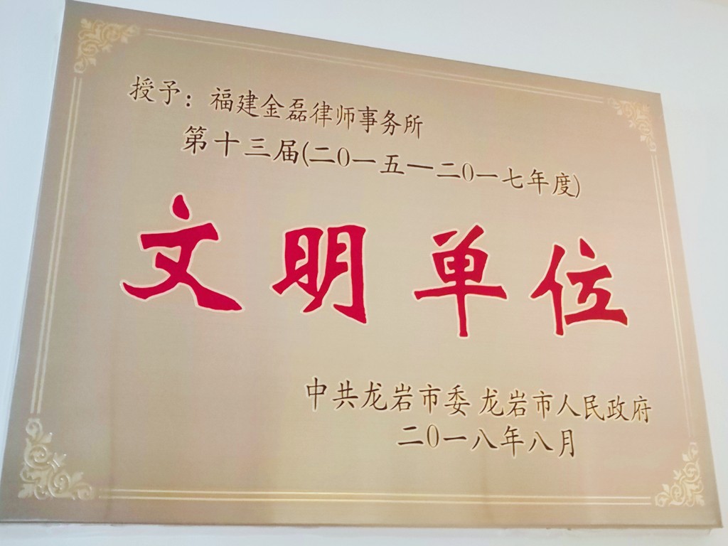 近日,福建金磊律师事务所被中共龙岩市委、市政府授予“第十三届文明单位”称号,这是金磊所在2004-2009年度“第十、十一届区级文明单位”和2009-2014年度“第十一、十二届市级文明单位”基础上,再次蝉联2015—2017年度“第十三届市级文明单位”称号。