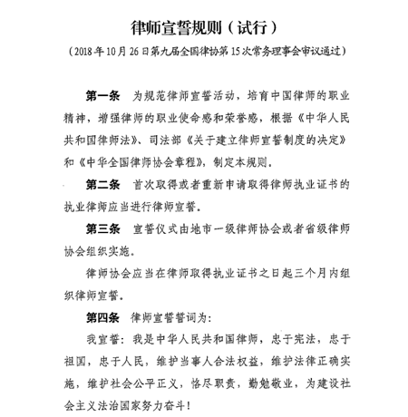 近日,全国律协印发了《律师宣誓规则(试行)》,从组织主体、誓词内容、宣誓程序、礼仪要求等方面对律师宣誓活动进行了规范,为组织开展好此次集体宣誓活动奠定了基础。