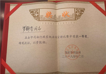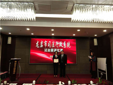 为进一步深化全市司法行政系统“一学三比”大练兵大比武活动,打造过硬司法行政队伍,推进队伍正规化、专业化、职业化建设,全面提升干部的综合素质和履职能力,把活动成果真正体现在推动工作上,12月28日上午8时,由龙岩市司法局主办的全市司法行政系统法制宣讲比赛在龙岩财富酒店二部七楼腾飞厅举行,金磊所罗静岑律师代表耀彩网参赛,并荣获一等奖。