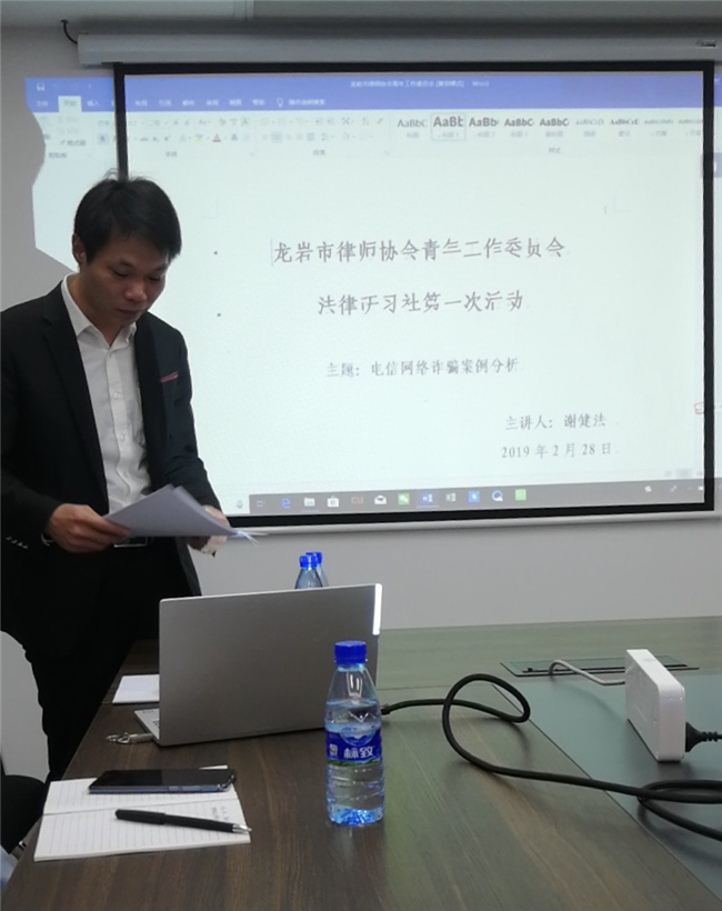 2019年2月28日晚,龙岩市律协青工委法律研习社在龙岩市律协会议室举办了2019年第一次活动,活动主题是《电信网络诈骗案例分析》,针对龙岩新罗区多发的电信网络诈骗犯罪辩护进行了专项研习,研习由福建津都律师事务所谢健法律师主讲。青工委副主任戴永琦及全体委员、部份青年律师参加了本次活动。
