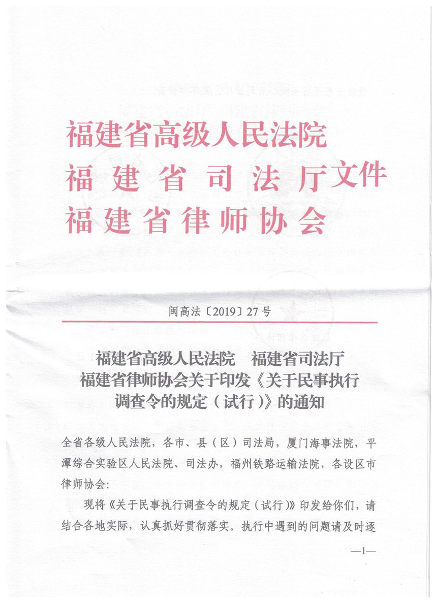 主页 / 公告通知/ 福建省高级人民法院 福建省司法厅 福建省律师协会关于印发《关于民事执行调查令的规定(试行)的通知》