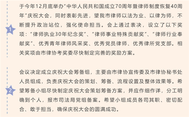 会上,市律师行业党委书记郑林向与会人员阐述了市律协拟举办庆祝“中华人民共和国成立70周年暨律师制度恢复40周年”系列活动的原因及意义,并传达了龙岩市司法局党组书记、局长余德辉同志的指示。余德辉局长强调,这么多年来,我市律师对龙岩的发展起到很大的积极作用,无论是维护社会稳定,服务经济发展,还是宪法宣传等都是不可或缺的。今年是中华人民共和国成立70周年暨律师制度恢复40周年,通过举办庆典晚会的方式向社会民众宣传社会主义法治和律师制度,增强我市律师的责任感、荣誉感、使命感,促进我市律师业的健康发展。