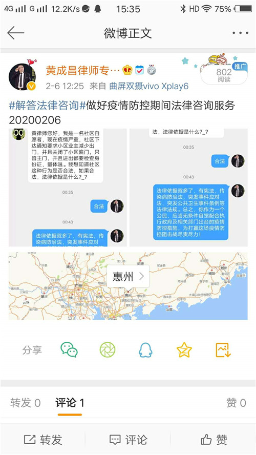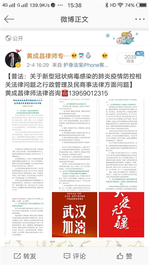 黄成昌律师事务所通过新浪微博、微信朋友圈、亲友微信群,适时分享转发新型冠状病毒肺炎预防手册、疫情动态权威发布、造谣传谣的法律责任等方面的文章累计63篇,正确引导亲友和社会公众,积极响应党中央、国务院和省、市、区党委、政府的号召,自觉参与、配合打赢疫情防控阻击战。
