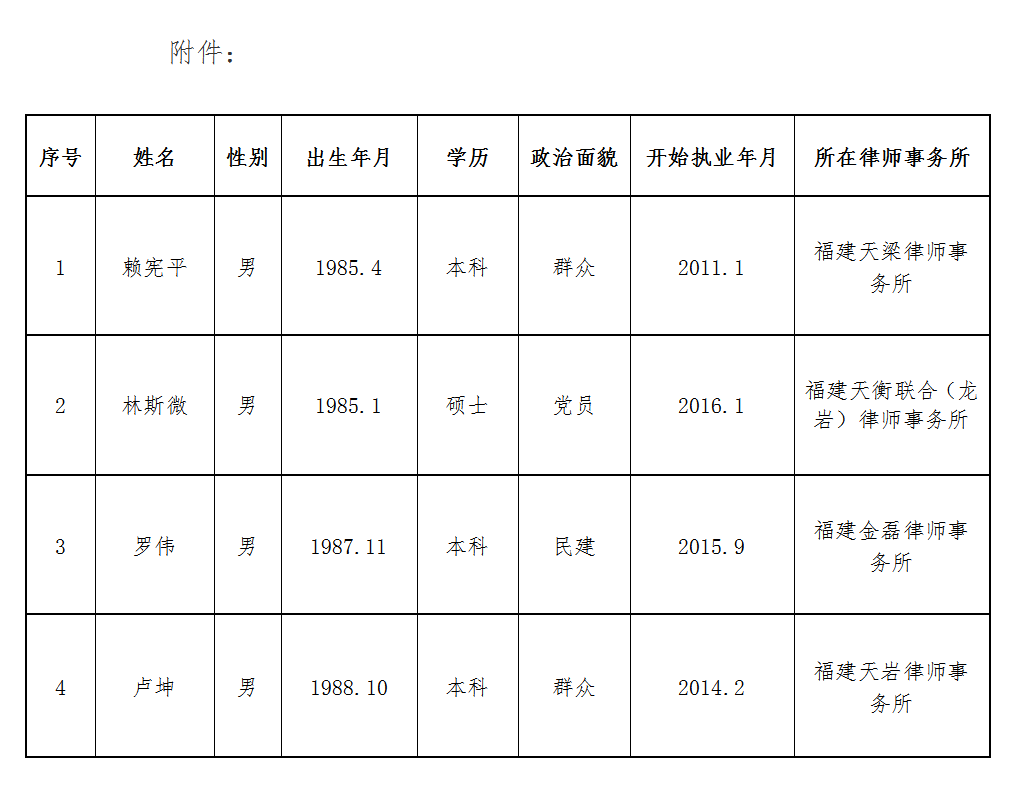 根据《福建省律师协会关于更新福建省优秀青年律师人才信息库的通知》(闽律通〔2020〕14号)规定的程序和条件,经律师事务所推荐,市律协选拔产生入选福建省律师协会青年律师人才库成员(龙岩4名),现将名单予以公示。