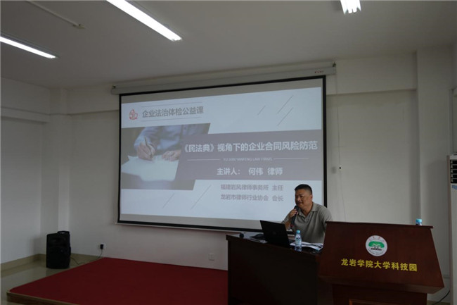 (三)普法讲座:2020年8月4日下午3点30分,何伟律师亲自带领团队至龙岩学院大学科技园开展了名为《<民法典>视角下的企业合同风险防范》的企业法制体检公益课,在两小时的讲座中何伟律师为科技园内的企业负责人们讲述了民法典视角下合同签订前、签订时和签订后的风险防范,为大家普及了企业运营过程中的注意事项,得到了大家热烈的响应。
