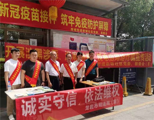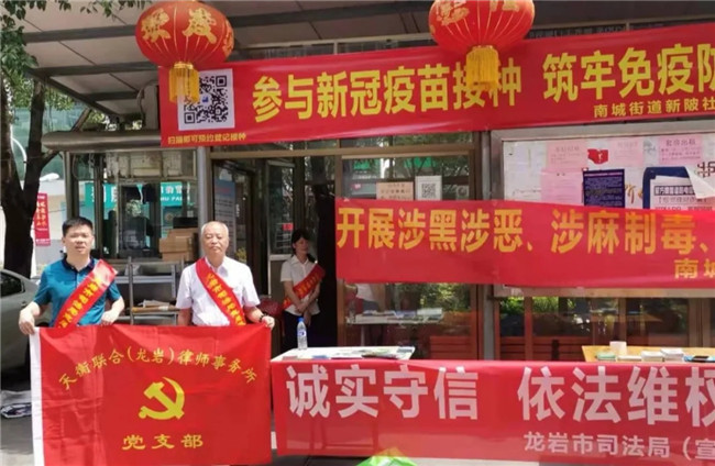 为了迎接建党100周年,围绕“我为党旗添光彩”主题实践活动,福建天衡联合(龙岩)律师事务所党支部在龙岩市司法局市直机关党委的引领下,于2021年5月28日组织党员律师前往龙岩市新罗区南城街道新陂社区开展“诚实守信 依法维权”的普法宣传活动,天衡律师现场接受社区居民法律咨询共计10余人次,发放法律宣传资料100余份,通过答疑解惑和法律普及相结合的方式进行宣传,取得了良好的社会效果,获得社区居民的一致好评。