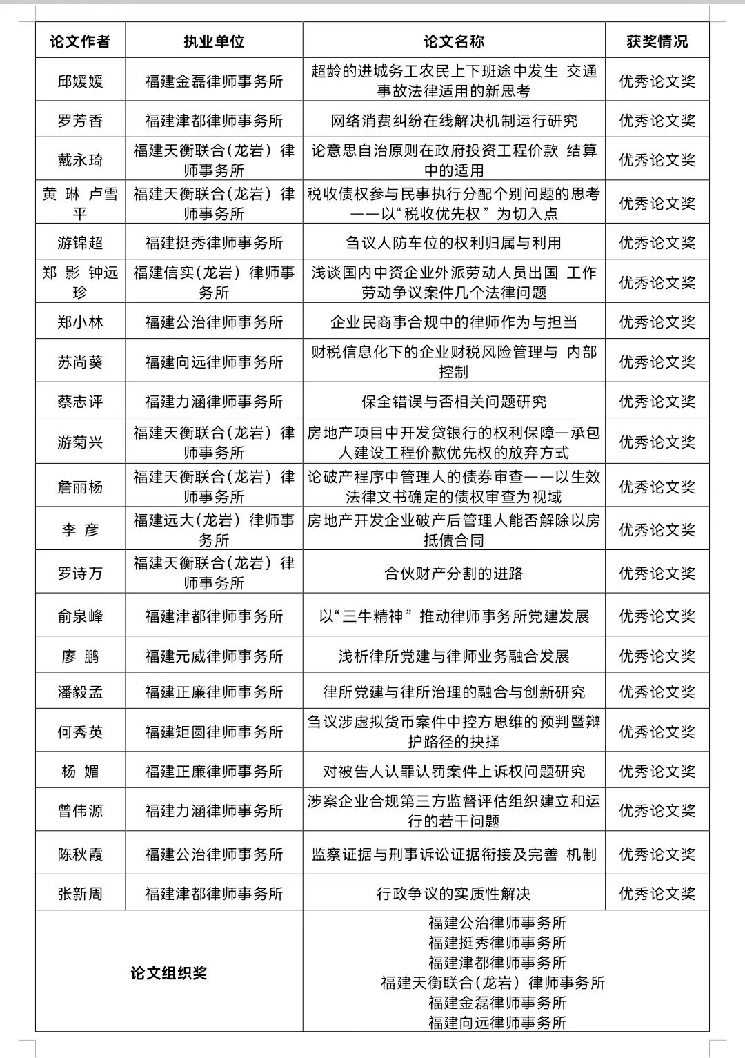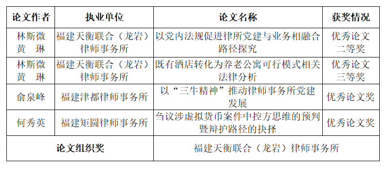 10月21日-22日,主题为“践行司法部党组‘五点希望’,做党和人民满意的好律师”的2023年福建律师论坛在三明顺利举行,我市选送的8篇论文获选参加本次省论坛的研讨交流,8篇入选论文作者代表参加了本次论坛,杜国长副会长作为领队带队参加论坛。福建天衡联合(龙岩)律师事务所林斯微律师、黄琳律师撰写的《以党内法规促进律所党建与业务相融合路径探究》《既有酒店转化为养老公寓可行模式相关法律分析》分获二等奖、三等奖。福建津都律师事务所俞泉峰律师撰写的《以“三牛精神”推动律师事务所党建发展》、福建矩圆律师事务所何秀英律师撰写的《刍议涉虚拟货币案件中控方思维的预判暨辩护路径的抉择》均获优秀论文奖。福建天衡联合(龙岩)律师事务所获论文组织奖。