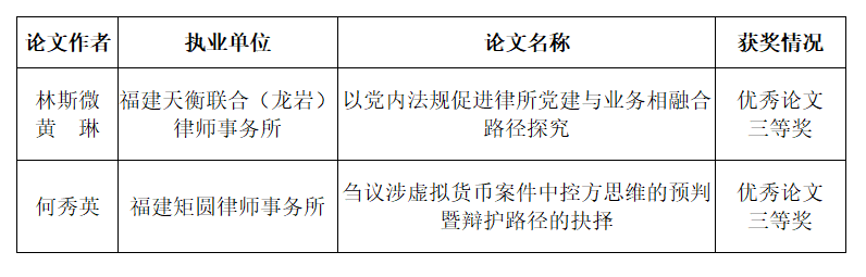 10月28日至29日,在江苏南京举办的第十八届华东律师论坛(安徽、福建、浙江、山东、江西、上海、江苏)上,林斯微律师、黄琳律师撰写的《以党内法规促进律所党建与业务相融合路径探究》、何秀英律师撰写的《刍议涉虚拟货币案件中控方思维的预判暨辩护路径的抉择》均获三等奖。