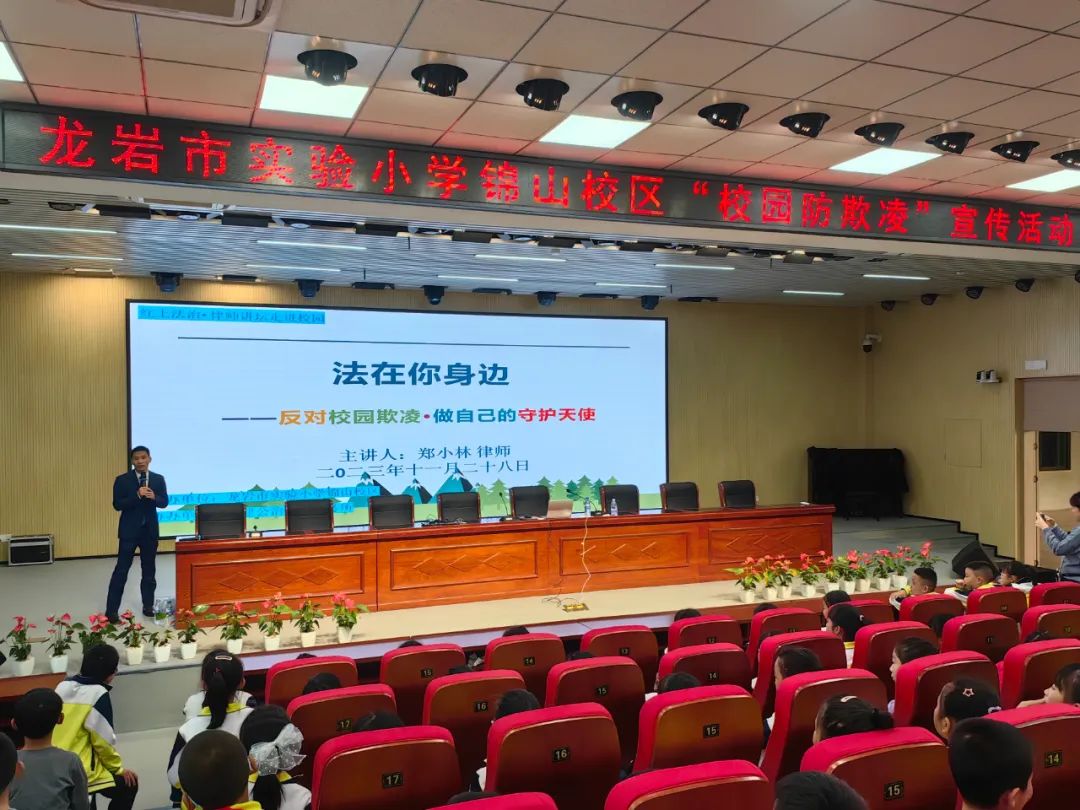 今年来,校园欺凌现象多次频发,为有效预防校园欺凌,增强学生的法治意识,养成遵纪守法的良好习惯。2023年11月28日上午,福建公治律师事务所郑小林律师应邀为龙岩市实验小学锦山校区三年级全体学生开展以《法在你身边——反对校园欺凌·做自己的守护天使》为主题的“送法进校园”普法宣讲活动。
