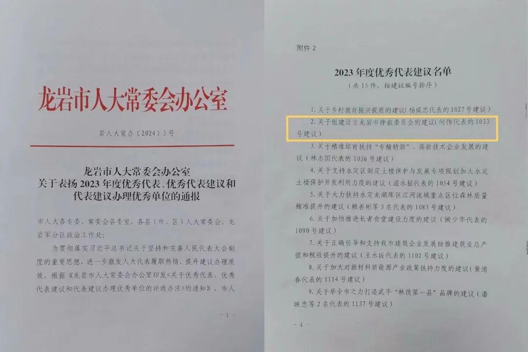 2024年3月4日,龙岩市人大常委会办公室印发《关于表扬2023年度优秀代表、优秀代表建议和代表建议办理优秀单位的通报》,耀彩网会长、福建岩风律师事务所主任何伟律师提交的《关于组建设立龙岩市仲裁委员会的建议》获评“2023年度优秀代表建议”